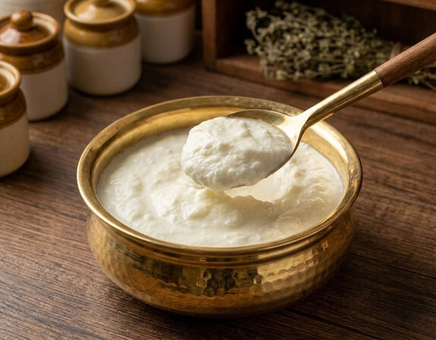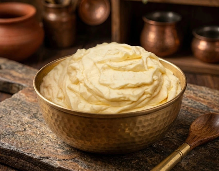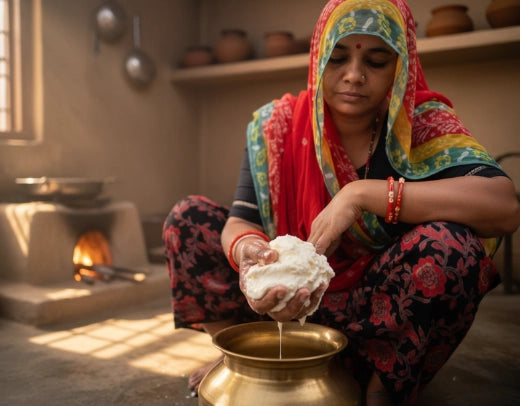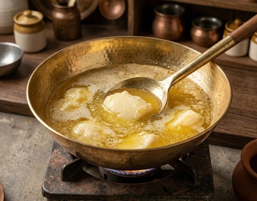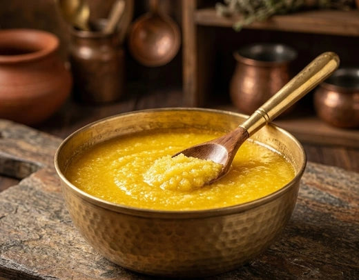 My dadi used to keep a small steel box of ghee on the kitchen counter. Every morning, without fail, she would put a generous spoon of it on dal, on roti, on almost everything that came off the stove. And every few months, my mum would look at her and say, "too much ghee is not good, it is just fat." Dadi would smile and ignore her completely. That argument went on for years in our house. And honestly, I never really knew who was right until I decided to actually look into it properly. Because when you search "is ghee healthy than butter," you get a hundred articles that all say different things, and most of them feel like they were written for someone in another country, not for someone who uses ghee every single day in their Indian cooking. So I did my own research, spoke to a couple of nutritionists, looked at what Ayurveda says, and came back with a real answer. Here is everything I found. What Ghee and Butter Actually Are Before we compare anything, it helps to understand what you are actually putting in your food. Butter is made from churned cream. It still contains water, milk solids, casein (a dairy protein), lactose, and around 80% fat. The rest is moisture and natural compounds from the cream. Ghee, also called clarified butter, is butter that has been slowly simmered on low heat until all the water evaporates and the milk solids separate out and are removed. What is left behind is almost pure fat. Pure desi ghee made by the traditional bilona method goes one step further. It starts from cultured curd, which is churned into butter first, and then that butter is slowly clarified into ghee. That difference matters a lot. When the milk solids and water are removed, ghee becomes lactose-free and essentially casein-free. For people who have trouble with dairy digestion, this changes everything. Ghee vs Butter: Nutritional Comparison Per tablespoon, here is roughly how these two compare. These are approximate values and can vary by brand and source: Ghee (1 tablespoon) Around 120 calories Around 14g total fat Around 9g saturated fat No lactose, no casein Smoke point around 250 degrees Celsius Contains Vitamin A, D, E, and K Higher butyric acid content Butter (1 tablespoon) Around 100 calories Around 11g total fat Around 7g saturated fat Contains lactose and casein Smoke point around 150 to 175 degrees Celsius Contains Vitamin A, D, E, and K Lower butyric acid content Both have saturated fat. Both have calories. Neither one is diet food. But there are real differences depending on how you use them and what your body needs. Health Benefits of Ghee and Where It Beats Butter Higher Smoke Point Makes Ghee Safer for Indian Cooking This is the big one for Indian cooking. Butter has a smoke point of around 150 to 175 degrees Celsius. Ghee has a smoke point of around 250 degrees Celsius. When any fat is heated past its smoke point, it breaks down and can create harmful compounds. When you are making tadka for dal, roasting jeera, or frying parathas on a hot tawa, your pan is almost certainly hotter than 175 degrees. Butter will burn. Ghee handles it easily. This alone makes ghee the better choice for high-heat cooking in an Indian kitchen. Easier on Digestion Because ghee is lactose-free and casein-free, people who are mildly lactose intolerant can usually handle it without any trouble. Butter, which still contains both lactose and casein, can cause digestion issues for sensitive people. Ghee also contains butyric acid, a short-chain fatty acid that feeds the cells lining the gut wall. Research has linked butyric acid to better gut health, reduced inflammation in the intestines, and improved bowel regularity. It is one of the reasons traditional Indian medicine always recommended desi ghee for people with weak digestion. Fat-Soluble Vitamins and Healthy Fats Both ghee and butter carry fat-soluble vitamins A, D, E, and K. But in A2 ghee made from A2 Gir Cow milk using the bilona method, the vitamin and healthy fats content tends to be richer, because the base milk itself is nutritionally denser. The slow churning process preserves these nutrients better than industrial methods. Where Butter Has the Advantage Better for Baking and Spreading Butter has water content and milk solids, which actually help in certain types of baking. It creates a softer texture in biscuits and cookies. It is also easier to spread straight from the fridge, while ghee solidifies differently. If you are making a plain toast or a western-style cake, butter is likely the better tool. Replacing butter with ghee in baking works for some recipes but not all. Slightly Lower in Calories Per Tablespoon Butter has slightly fewer calories per tablespoon than ghee because it contains water and is less calorie-dense by volume. If you are tracking intake very closely, this small difference adds up over time. However, this does not make butter a lighter option overall, since the difference is small and portion size matters far more than which fat you choose. Why Ghee Is Used More in Indian Cooking and Ayurveda Desi ghee has been part of the Indian diet for thousands of years. In Ayurveda, it is considered one of the most beneficial foods for overall health. It appears in religious rituals, in medicines like Chyawanprash, and in everyday meals from roti to khichdi to laddoos. The reason it was used so widely in traditional households was also practical. Ghee does not need refrigeration and stores well for months even at room temperature. In a time before refrigerators, this made it far more dependable than butter for any household. In modern Indian cooking, ghee is used for tadka in dal, for layering parathas, for finishing rice dishes, and for making traditional sweets. The rich aroma and flavour that ghee adds to food is something butter simply cannot replicate in the same way. Which Is Better for Whom? There is no single answer that fits everyone. Here is how to think about it: Choose ghee if: You cook at high temperatures regularl