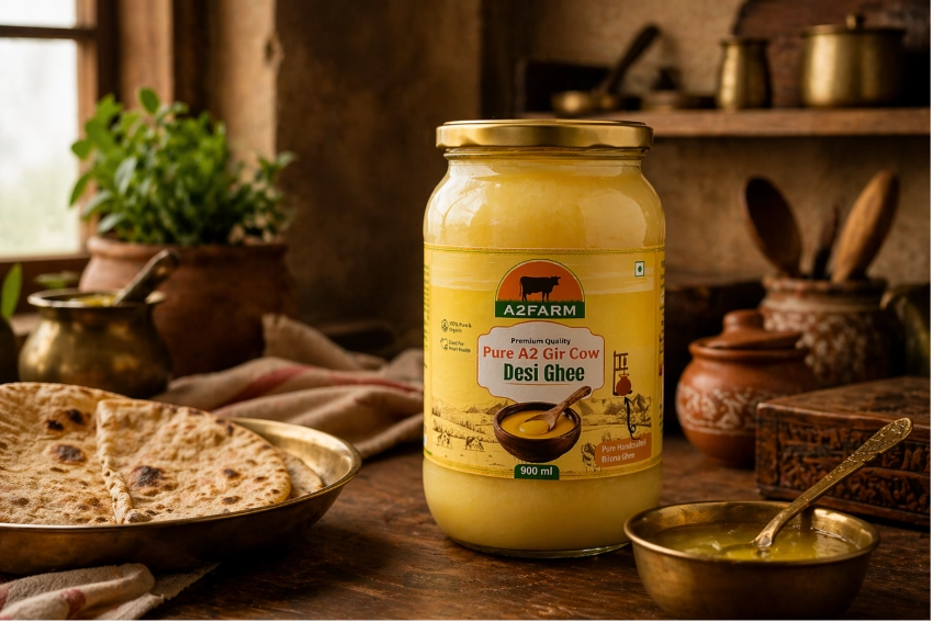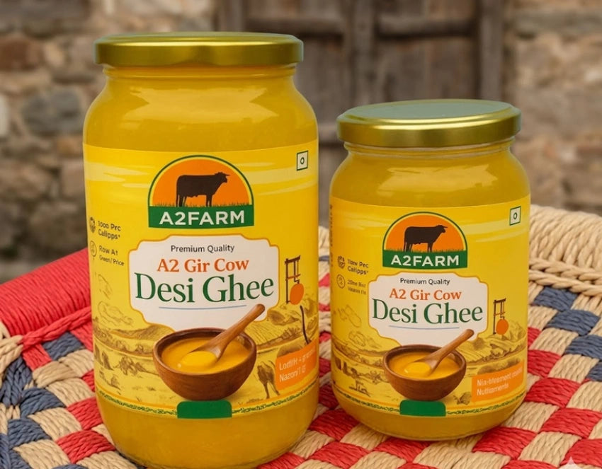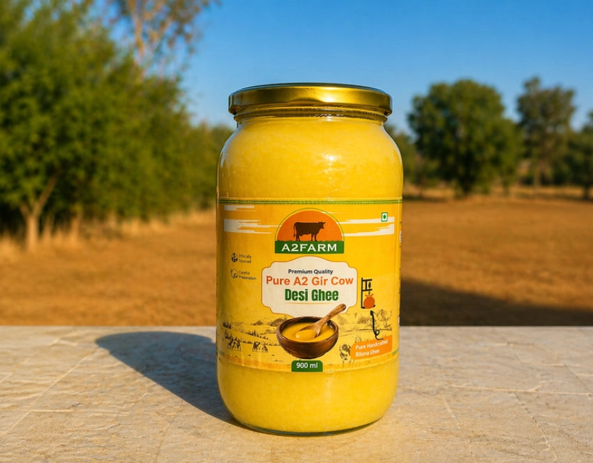 I never thought a small steel jar sitting in my grandmother's kitchen would change how I think about food. She kept a handwritten diary, pages filled with home remedies, ingredient notes, and little observations she made while taking care of my grandfather who had diabetes. One entry that kept coming up: pure desi cow ghee, specifically from Gir cows, made the old-fashioned way. That curiosity started a journey I now share with you. If you have been searching for a2 cow ghee benefits and wondering whether it is worth the switch, this is the honest, real-life breakdown you need. No jargon. No fluff. Just what actually matters. What is A2 Cow Ghee? (And Why Does It Even Matter?) Understanding the A2 Protein Difference Most commercial ghee in India today is made from crossbred cow milk that contains the A1 beta-casein protein. A2 cow ghee, on the other hand, comes from indigenous desi cows, especially the Gir cow, whose milk naturally carries only the A2 beta-casein protein. This difference is not just marketing. Research suggests A1 protein may be harder on the digestive system for some people, while A2 milk is considered easier to digest and gentler on the gut. For a vegetarian household like ours, where ghee is part of almost every meal, this distinction matters a lot. So when people talk about a2 gir cow ghee benefits, they are really talking about a combination of the right breed, the right milk, and the right process. All three together is what makes it special. How Bilona Ghee is Made: The Method That Changes Everything The Traditional Bilona Method, Step by Step My grandmother's diary had a whole section on how ghee should be made. What she described without naming it was the Bilona method, the traditional hand-churning process that has been used in Indian households for generations. Here is how it works: Step 1: Fresh A2 milk from the Gir cow is boiled and cooled. Step 2: It is curdled into curd (dahi) using a natural starter. Step 3: The curd is hand-churned using a wooden churner (bilona) to separate butter. Step 4: The butter is then slow-heated over a low flame until the pure ghee separates naturally. This slow, careful process means the fat-soluble vitamins, natural aroma, and nutritional value are preserved, not stripped away by high-heat industrial processing. That is why bilona ghee benefits go beyond what regular commercial ghee can offer, it is simply a more complete, more natural product. At A2Farm's Pure A2 Gir Cow Ghee, this exact method is followed, because there are no shortcuts worth taking when it comes to real ghee. Top A2 Cow Ghee Benefits You Should Know About Let me walk you through the benefits that came up again and again, both in my family's experience and in what Ayurveda has said for centuries. These are the real benefits of a2 cow ghee worth knowing. 1. Better Digestion and Gut Health This is the one that surprised our family the most. My grandfather, dealing with diabetes, had a sensitive stomach and struggled with heavy meals. After switching to desi cow ghee, there was a noticeable improvement in his digestion and comfort after eating. The reason is butyric acid, a short-chain fatty acid naturally present in A2 ghee. It is the primary fuel for the cells lining your colon, helping repair the gut lining and reducing inflammation. For anyone dealing with bloating, sluggish digestion, or gut health concerns, this is genuinely meaningful. It also stimulates the secretion of digestive enzymes, making your body process food more efficiently. 2. Stronger Immunity A2 ghee is rich in fat-soluble vitamins, specifically vitamins A, D, E, and K. These are not just general health nutrients. Vitamin A supports the immune response. Vitamin D regulates how the immune system reacts to infection. Vitamin E is one of the most powerful antioxidants the body uses. Vitamin K supports clotting and bone health. Getting all four from a single pure, natural food source is genuinely valuable, especially in a vegetarian diet where some of these vitamins can be harder to get in adequate amounts. Regular use of a2 ghee in daily cooking is a simple way to support immunity without any supplements. 3. Heart Health Support A lot of people hesitate here because they associate ghee with cholesterol. But the truth is more nuanced. A2 cow ghee contains omega fatty acids and CLA (conjugated linoleic acid), both of which have been associated with supporting cardiovascular health when consumed in moderation. The healthy fats in Bilona ghee are different from processed trans fats. They do not clog arteries the same way refined vegetable oils can. Ayurvedic texts have consistently recommended ghee for heart health, not as a fat to fear, but as a nourishing fat that supports the body when used wisely. 4. Glowing Skin from the Inside I started noticing this about six weeks after we added A2 ghee back into our daily meals. Skin felt less dry, more supple. There is a reason traditional home remedies always included ghee for skin, it is rich in vitamins A and E, both essential for cell regeneration and skin health. The nutrient absorption benefit matters here too. Fat-soluble vitamins like A, D, E, and K are only absorbed properly when consumed with fat. Cooking vegetables and dal with a spoon of A2 ghee actually helps your body extract more nutrition from the meal. The skin glow people notice is not coincidence, it is better nourishment at a cellular level. 5. Sustained Energy Without Spikes Unlike refined carbohydrates that spike and crash your blood sugar, the medium-chain fatty acids in A2 ghee are metabolized quickly into energy without spiking insulin. For my grandfather, managing diabetes, this was meaningful. Ghee in small amounts with meals helped slow glucose absorption, keeping energy steadier through the day. This is also why athletes and people following active lifestyles are returning to ghee as a pre-workout or morning energy food. A spoon of ghee in warm water or with roti in the morn
